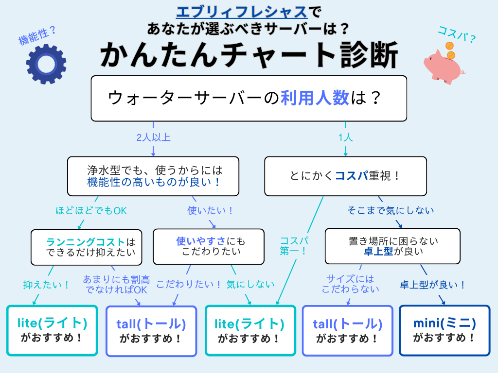 たった3つの設問に答えながら進むだけで、あなたに合ったウォーターサーバーがわかる診断チャートをご用意しました!