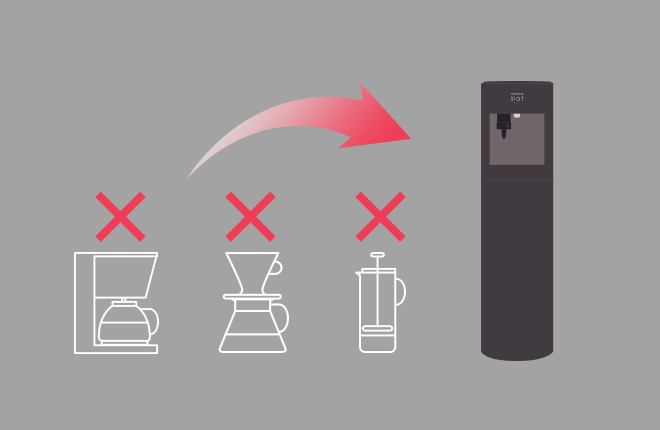 スラット+カフェなら、毎回水を継ぎ足す必要がなく、1杯ずつウォーターサーバーの水から沸騰させるので、飲みたい時にすぐにコーヒーを淹れることができますよ。